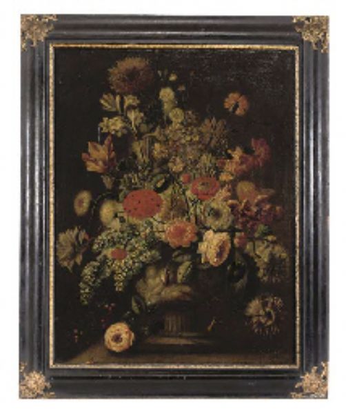 | Parrot tulips, roses, peonies, carnations, columbine and other flowers in a sculpted urn | |