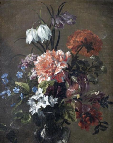 Chrysanthemums, narcissi, forget-me-nots and other flowers in a glass vase