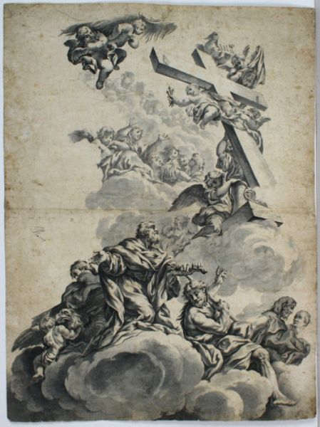 Johannes Evangelist, Petrus und Johannes der Täufer in Anbetung des Kreuzes