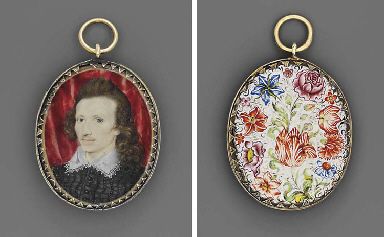 | A young gentleman, in embroidered black doublet with black buttons, lace-bordered white lawn collar, long curling brown hair fal | |