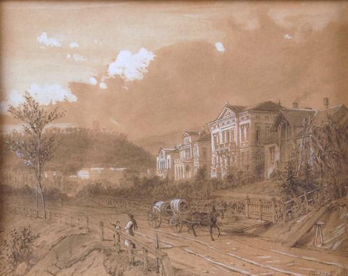 Viale di campagna con figure e carretto sullo sfondo di una città