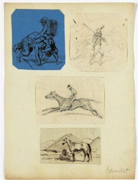 | Quatre études : deux soldats sur papier bleu, un convoi de grenadiers, un jokey à cheval, un cheval dessellé | |