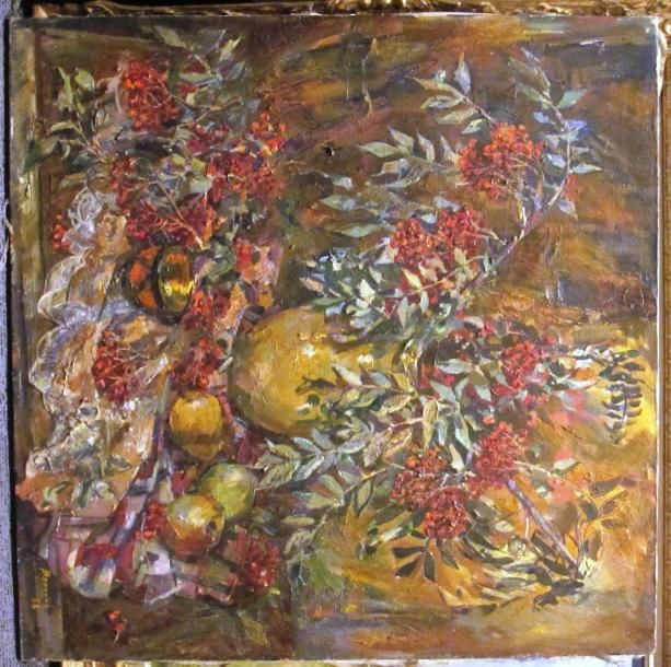Nature morte au bouquet de baies rouges, pommes sur un entablement