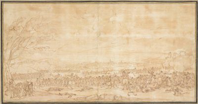 Reiterschlacht vor einer befestigten Stadt in hügeliger Landschaft.