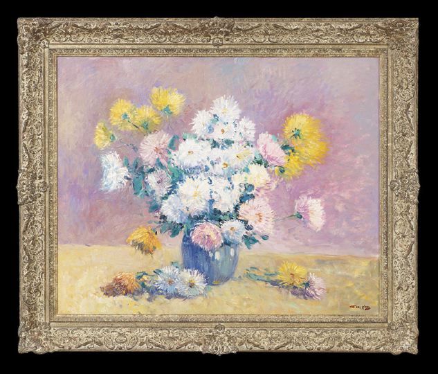 Chrysanthemum Still Life in a Blue Vase