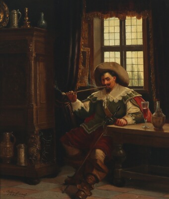 A pipe-smoking musketeer in a castle interior.