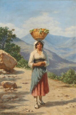 | Italian mountainscape with a young woman carrying a basket of fruits | |
