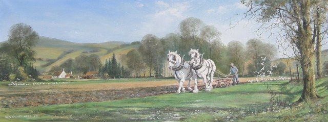 Farmer and horses pulling a plough