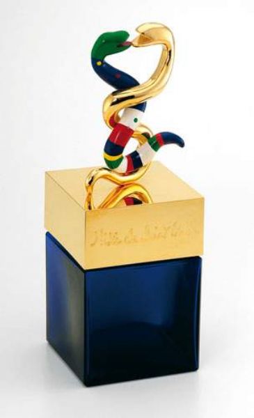 | flacon de parfum en verre bleu de forme rectangulaire, bouchon doré orné de 2 serpents | |