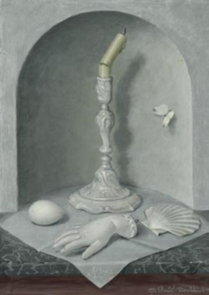 | Stilleben mit Kerze, Jakobsmuschel, Ei und Hand | |