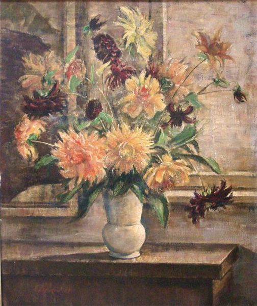 Blumenstillleben in einer Vase auf Tischkante arrangiert