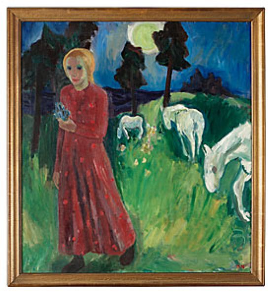 FLICKA PÅ ÄNG MED VITA HÄSTAR