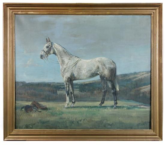 Study of a grey hunter with a saddle in a landscape