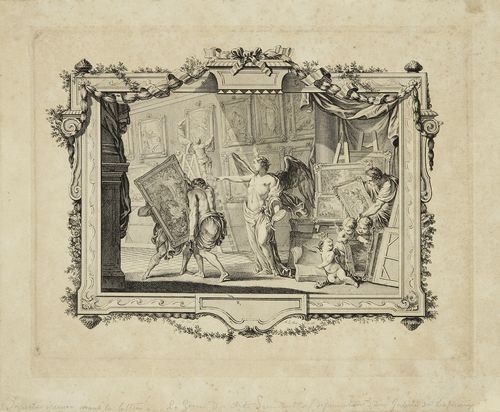 | Le Génie des arts présidant à l’organisation d’une galerie de tableaux. | |