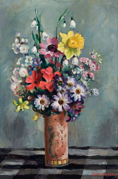Mixed Flowers in Pot on Checked Cloth