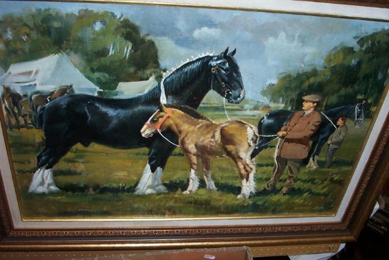 a scene at an agricultural show with two shire horses and a foal