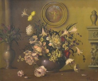 Still life with vases of flowers beside a fireplace and beneath a convex mirror