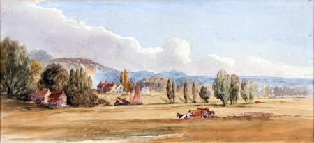 East Anglian Landscape with Cattle Grazing, Boat and Cottages Beyond