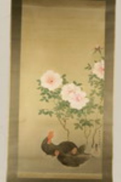 Kakemono-e of Cockrels and Peonies