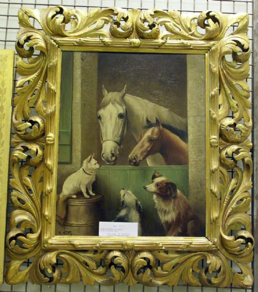Djurmotiv med hästar i spilta samt tre hundar