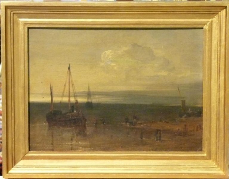 Kustmotiv med strand och båtar