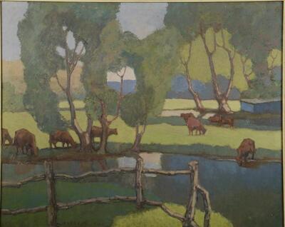 "The Cow Pasture", oil on canvas, signed lower left and dated 1941, signed, titled and dated verso, in cream painted molded frame, OS: 28 1/2" x 34 1/2, SS: 23" x 29". Retouched flaking lower right, scuffs and loss to lower edge of frame. | |