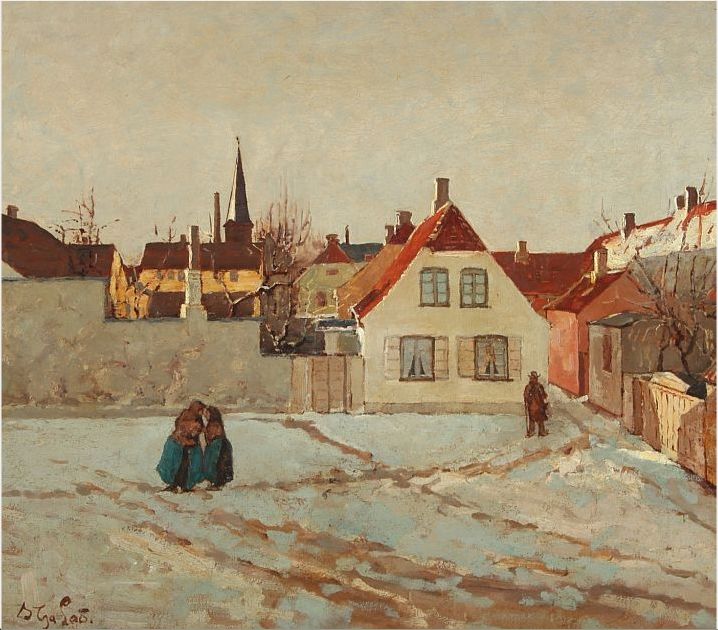 Winter cityscape with figures, Dragør, Denmark.