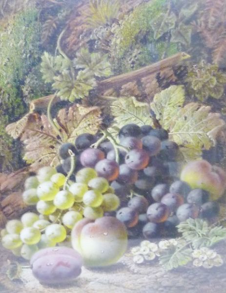 A still life of grapes, plums and peaches with leaf,