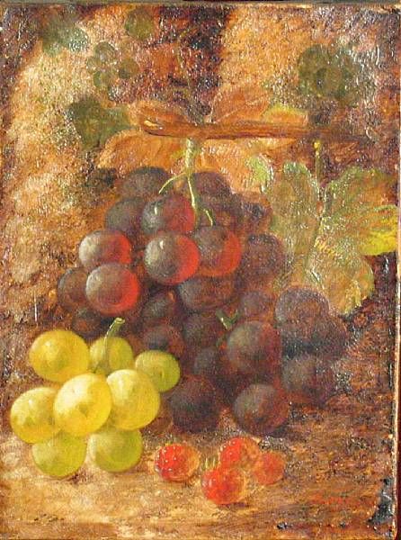 A still life with grapes and raspberries