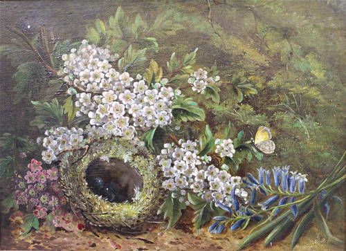 | Still life of eggs in a bird's nest, blossom and a moth on a mossy bank | |