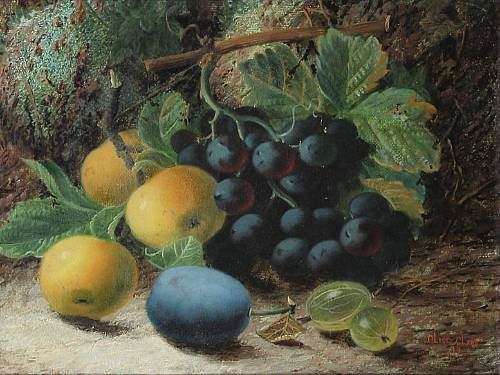 | Black grapes, apples, gooseberries and a plum against a mossy bank; plums, an apple and a strawberry against a mossy bank | |