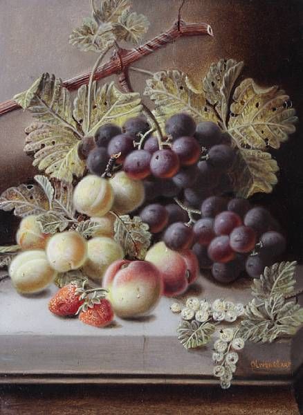 Black grapes, greengages, peaches and strawberries on a stone ledge