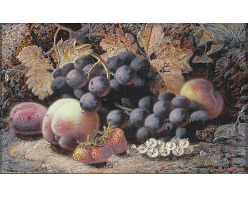 | Black grapes, peaches, strawberries, white currants and a plum against a mossy bank | |