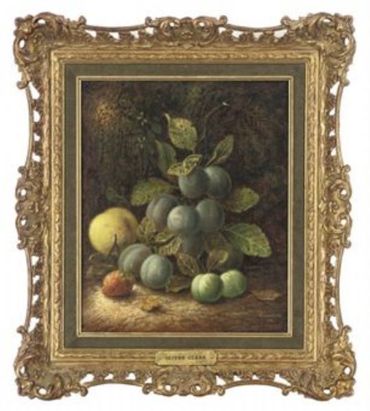 Damsons, greengages, a peach and a strawberry on a mossy bank