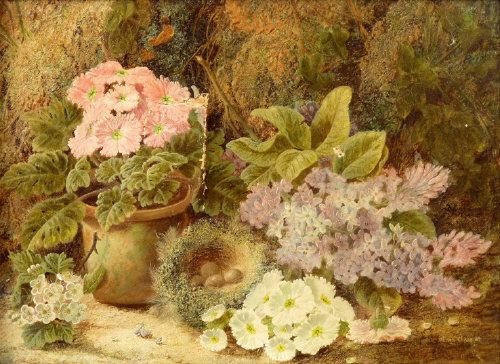 FLOWERS AND A BIRD'S NEST ON A MOSSY BANK