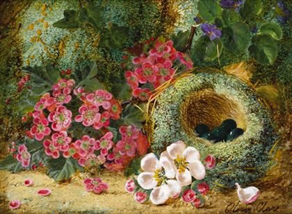 FLOWERS AND A BIRD'S NEST ON A MOSSY BANK