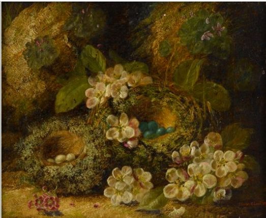 PRIMROSES AND BIRDS' NESTS ON A MOSSY BANK