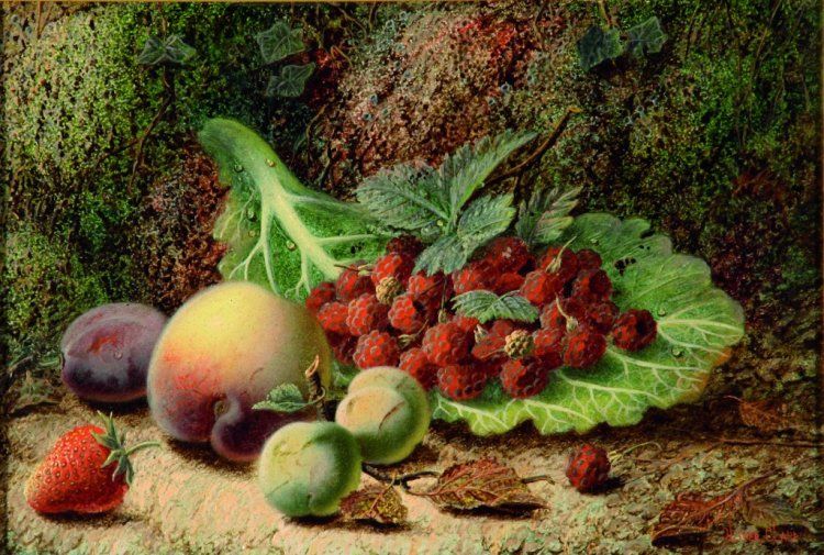 Still life of raspberries, a strawberry, peaches, plum and greengages