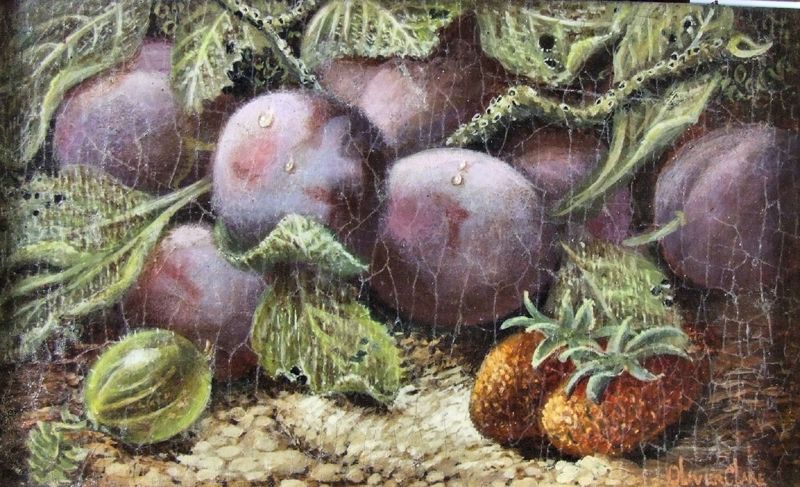 Still life with plums, gooseberries and strawberries