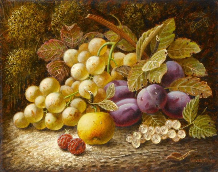 STILL LIFE WITH PLUMS, GRAPES, RASPBERRIES, WHITE CURRENTS AND AN APPLE