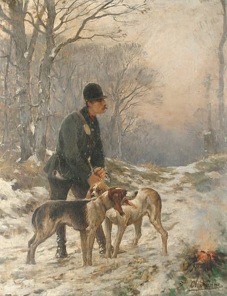 A huntsman with hounds in a winter landscape