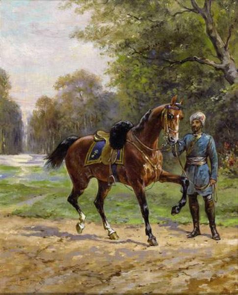 CHEVAL AUX ARMES COURONNEES ET SON LAQUAIS