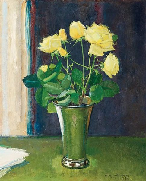 Still life with yellow roses in silver vase. (d)