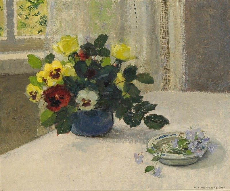 | stilleben med penséer i kruka samt fat med blå violer | |
