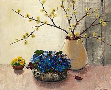 STILLEBEN MED TUSSILAGO OCH BLÅSIPPOR.
