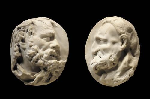 A PAIR OF GROTESQUE HEADS IN MARBLE RELIEF