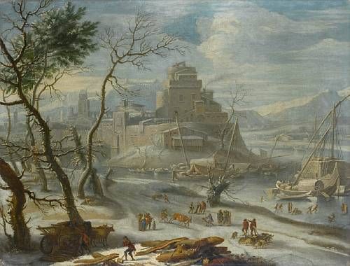 | A winter landscape with figures collecting firewood and others skating on a frozen river | |