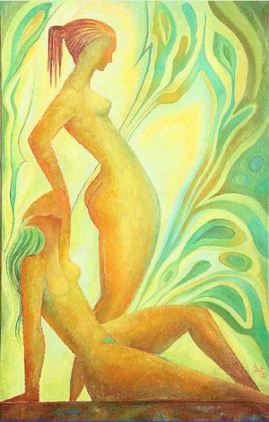 Composition with two women in green landscape