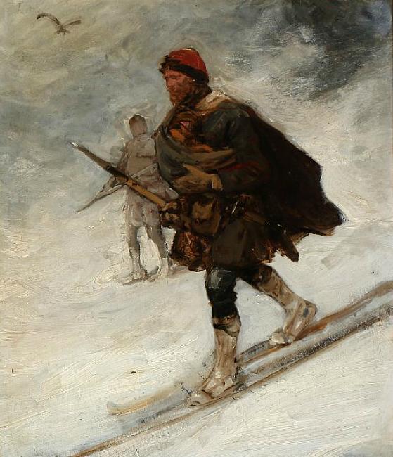 | Birkebeiners. Two skiers battling the snow | |