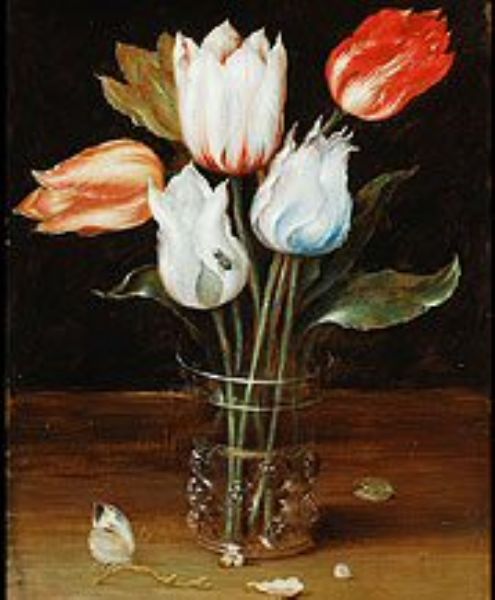 BLUMENSTILLLEBEN MIT FÜNF TULPEN IN EINEM GENOPPTEN GLASBECHER MIT SCHMETTERLING